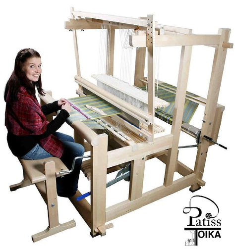 Standaard met een hangende rietlade. Inclusief verstelbaar weefbankje. De grote opening aan de zijkant maakt het gemakkelijk toegankelijk voor het aanbinden van de schering.